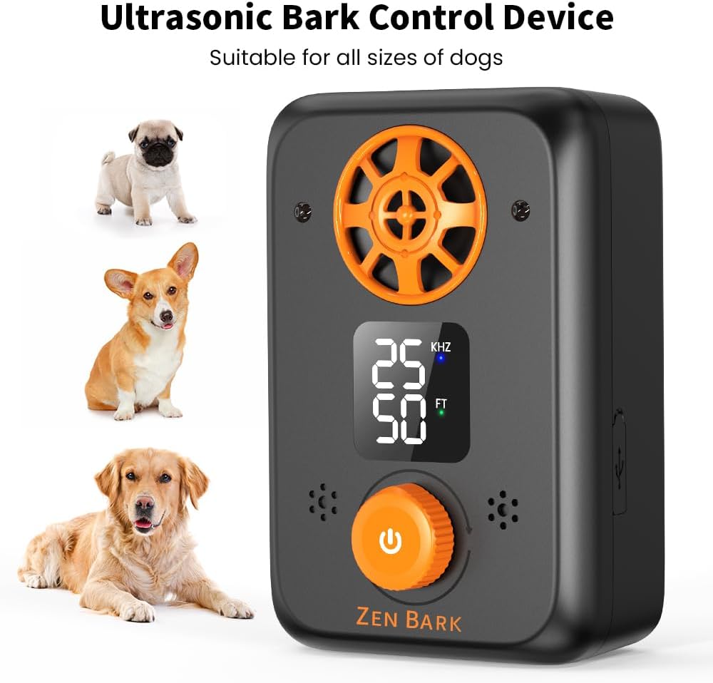 This UPGRADED 50 FT Ultrasonic Anti Barking Device effectively stops unwanted barking with safe ultrasound. It features five ultrasonic frequencies and three bark detection ranges to prevent dogs from getting used to a single sound. The large 1200 mAh rechargeable battery provides powerful all-day protection for your peace and quiet. An upgraded LED screen clearly displays the selected frequency and range. A fast Type-C USB port fully recharges the battery in just 2.5 hours for up to two months of standby time. With multiple frequencies, long battery life and easy-to-read display, this anti-barking device is sure to keep the noise down without harming man's best friend.