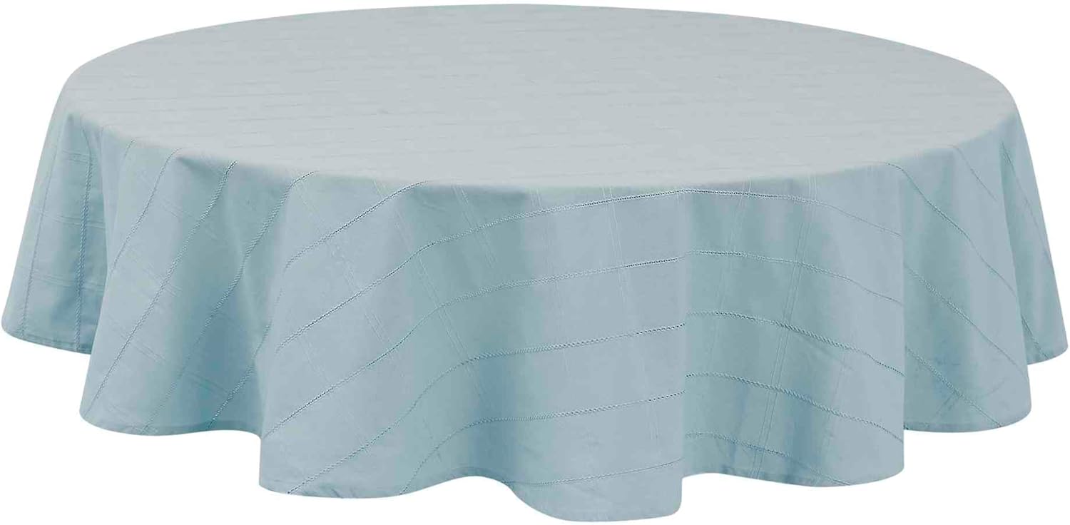 The Izod Chadwick Linen 70" Round Tablecloth features a textured woven windowpane design. The windowpane is made up of 3" squares bordered with double-woven rows and hem-stitched lines. Made of 55% cotton/45% polyester for soft feel and easy care, machine washable.